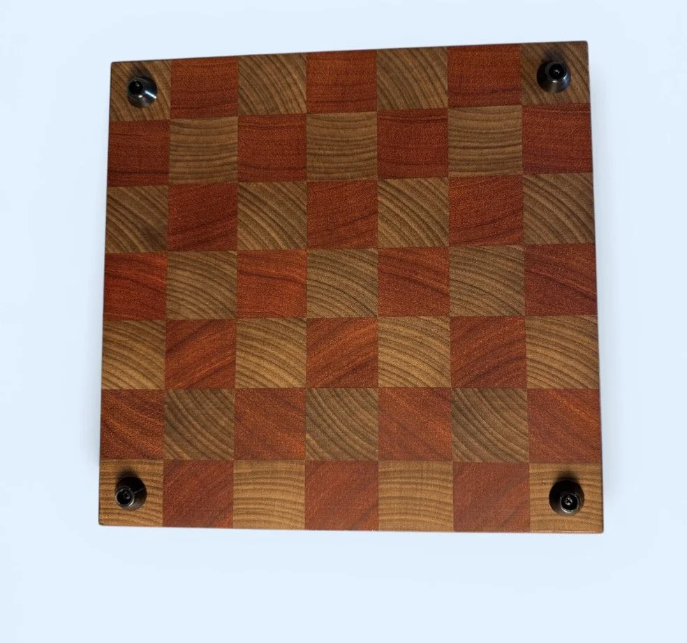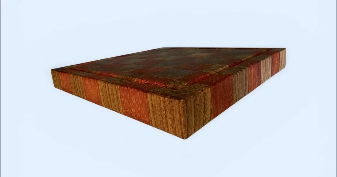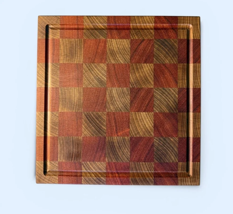 Bold, durable, and built to perform. This handcrafted checkerboard cutting board pairs vibrant padauk with rich afromosia for a striking look that stands out on any counter.