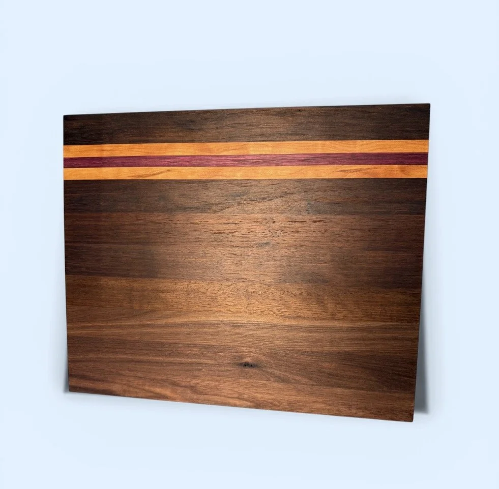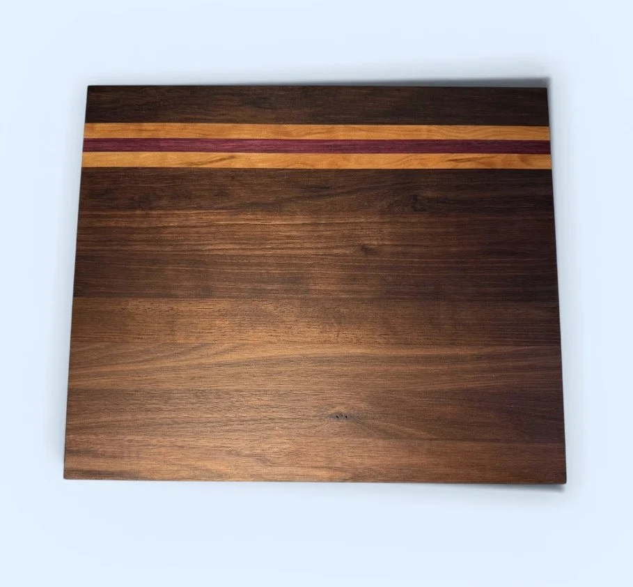 Serve in style with this handcrafted charcuterie board made from domestic walnut, tropical walnut, cherry, and purpleheart. The rich contrast of natural wood tones makes each piece truly one of a kind.